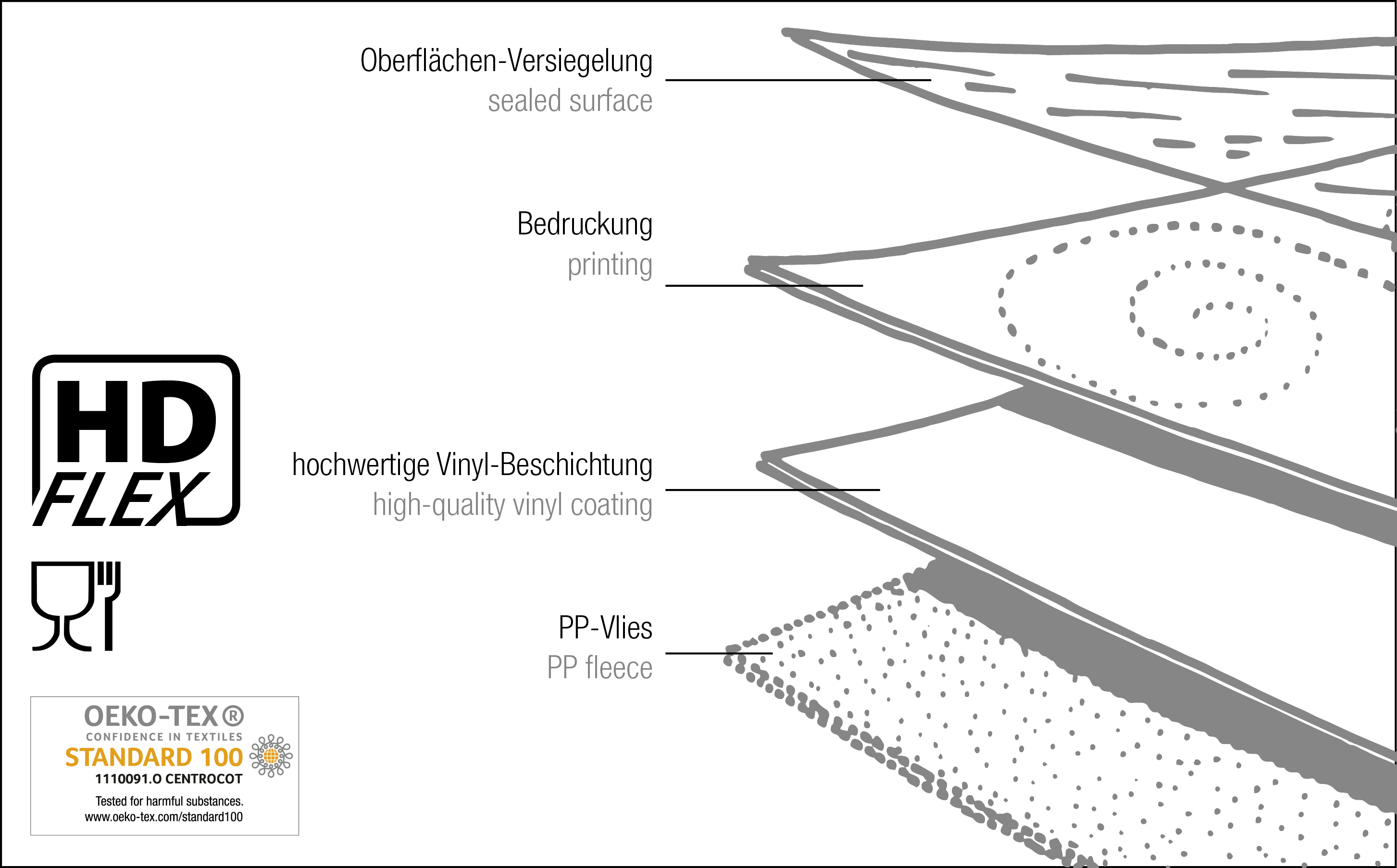 Pflegeleichte Wachstuchtischdecke mit flauschiger Vliesrückseite und innovativer HD-flex Beschichtung.