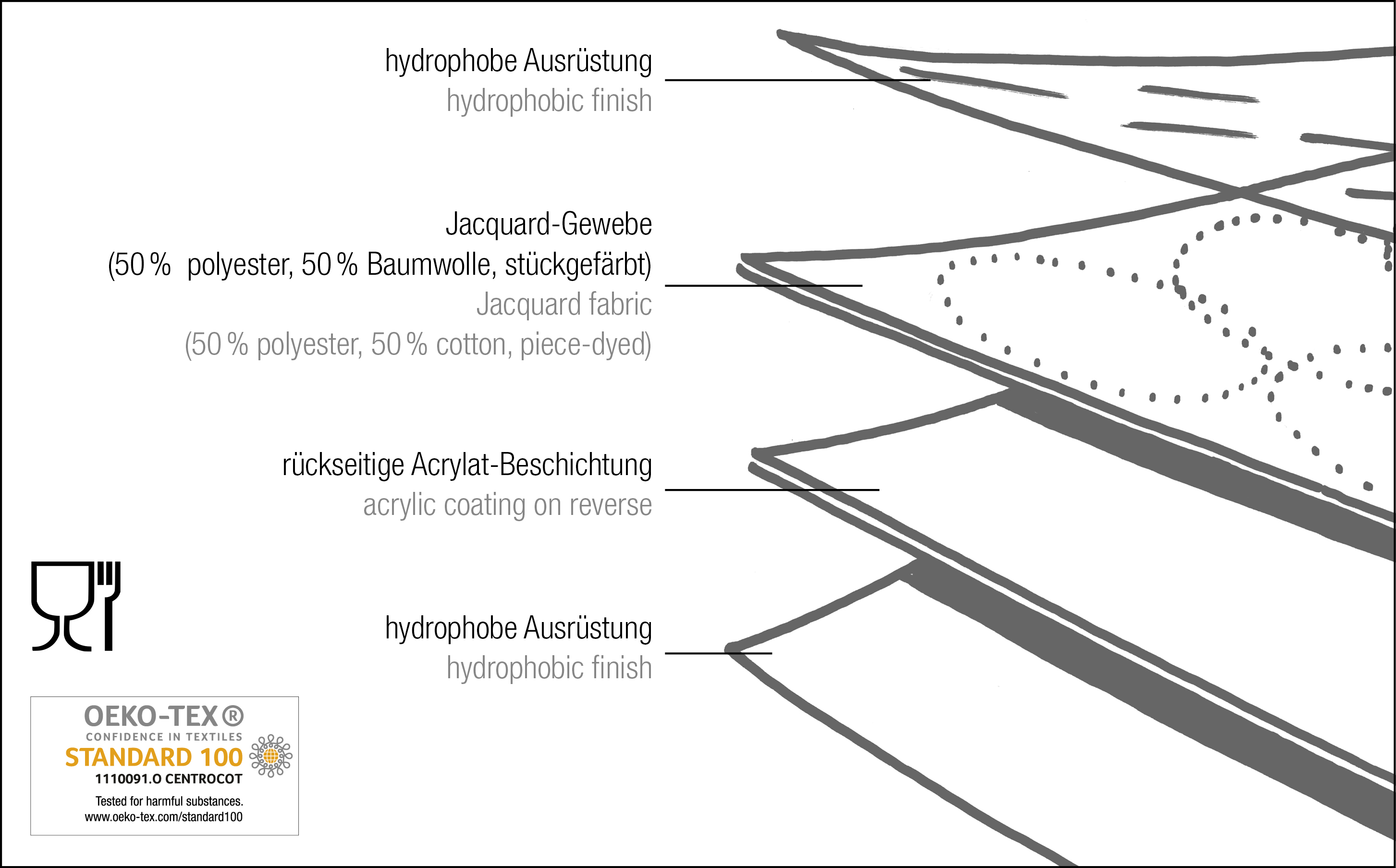 Eleganter Tischbelag aus Jacquard-Gewebe mit hochwirksamer Anti-Fleck-Ausrüstung (Lotus-Effekt) und rückseitiger Acrylat-Beschichtung. Wasserundurchlässig aber mit textilem Griff.