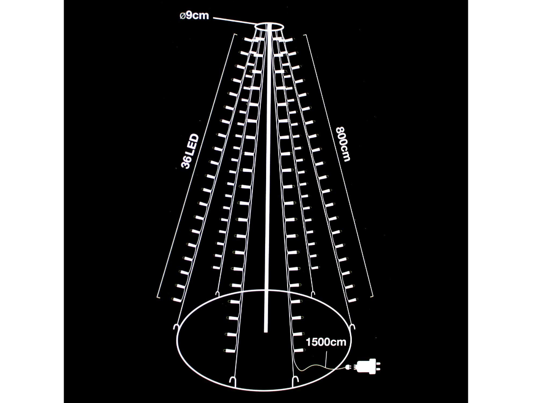 36 warmweißen LEDs. Jeder Strang ist 8m lang. Die Stränge sind oben an einem Ø9cm Metallring befestigt. Die Enden werden über