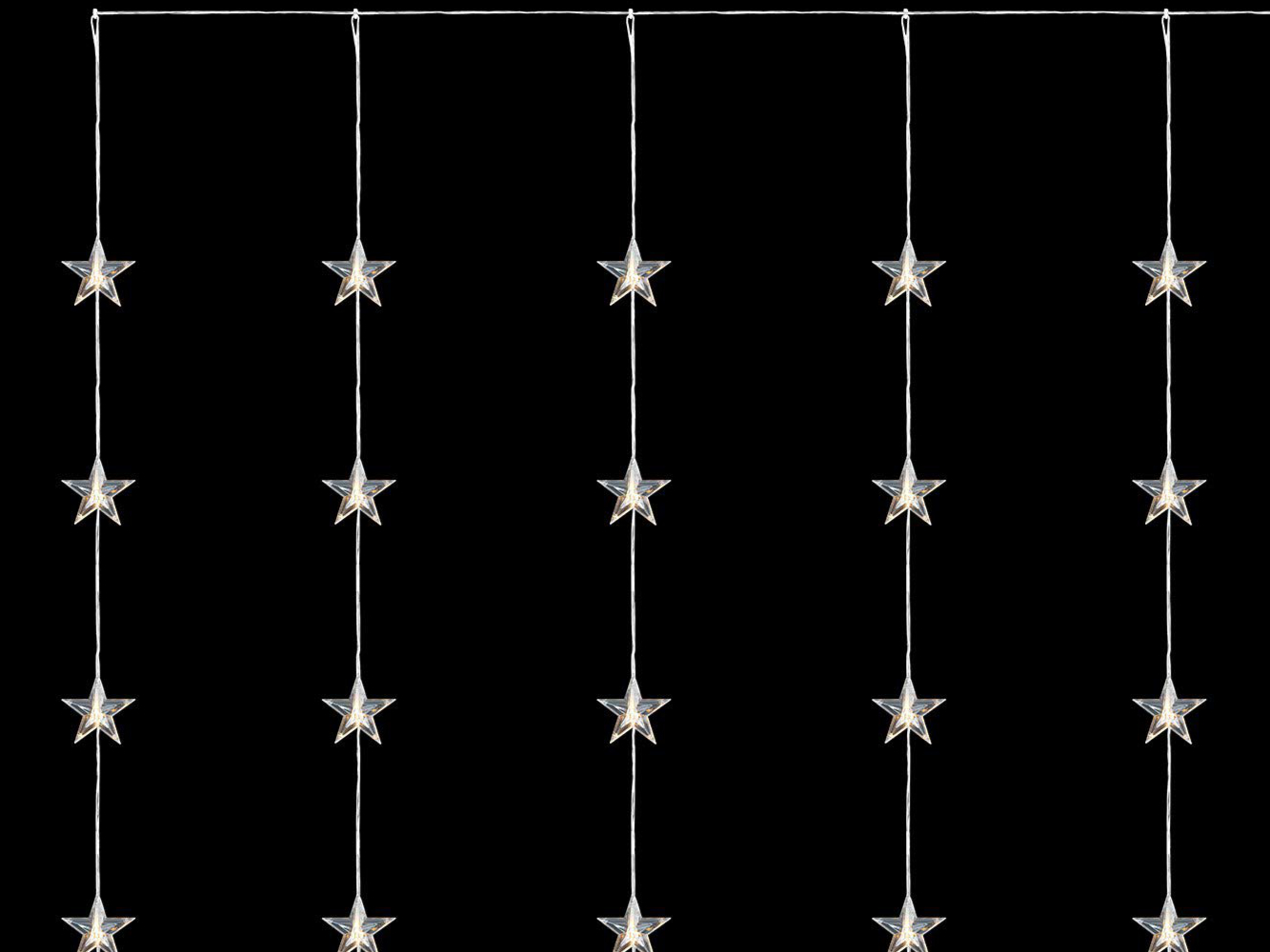 Dieser Sternenvorhang mit 30 warmweißen LEDs sorgt für eine gemütliche Stimmung in Ihren Räumen. Der 90cm breite Sternenvorhang besteht aus 5 Lichtersträngen, die 120 cm lang sind und
