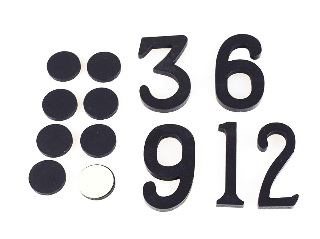 Gestalten Sie Ihre Wanduhr nach ihren Wünschen und lassen Ihrer Kreativität freien Lauf. Mit diesem Wanduhren-Set gelingt Ihnen das garantiert. Die Uhr überzeugt durch eine schlichte, zeitlose Eleganz. Sie besteht aus 13 Einzelteilen. Das Zentrum der Uhr besteht aus einem Kreis aus schwarzem Holz mit ca. 10cm Durchmesser. Dieser bildet die Basis und gleichzeitig die Halterung für die beiden Metallzeiger, welche schwarz lackiert sind und dadurch sehr edel wirken. Die Basis kann an der Wand durch einen kleinen Aufhängehaken befestigt werden. Der große Zeiger hat eine Länge von ca. 30 cm und der kleine eine Länge von ca. 23,5 cm. Weiterhin werden die Zahlen 3, 6, 9 und 12 aus lackiertem Holz mitgeliefert. Diese haben eine Höhe von ca. 10 cm und können frei nach Ihren Wünschen um das Zentrum angebracht werden. Sie bestimmen, wie groß Ihre Wanduhr werden soll. Für die Markierung der weiteren Zeitmarker werden 8 Kreise mit ca. 4cm Durchmesser breitgestellt. Sowohl die Zahlen und auch die Kreise werden an die Wand geklebt. Einfach die Folie auf der Rückseite abziehen und die Teile an der gewünschten Stelle positionieren. So zaubern Sie ganz schnell Ihre individuelle Wanduhr, die so bestimmt nur bei Ihnen zu Hause hängt.